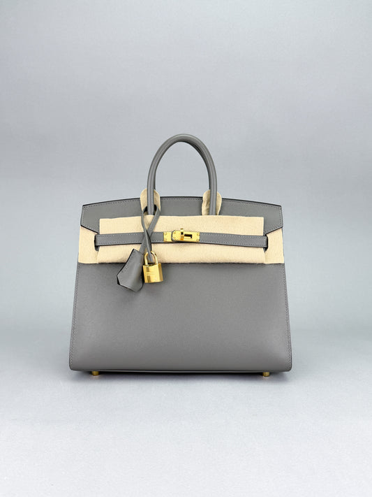 HERMES Birkin 25 Sellier Epsom Gris Misty Permabrass Hardware K Stamp Unworn