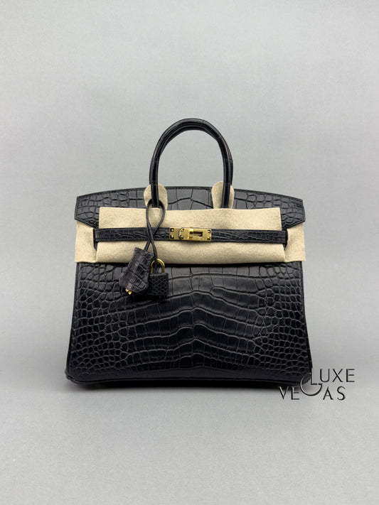 HERMES Birkin 25 Matte Alligator Black Gold Hardware Unworn