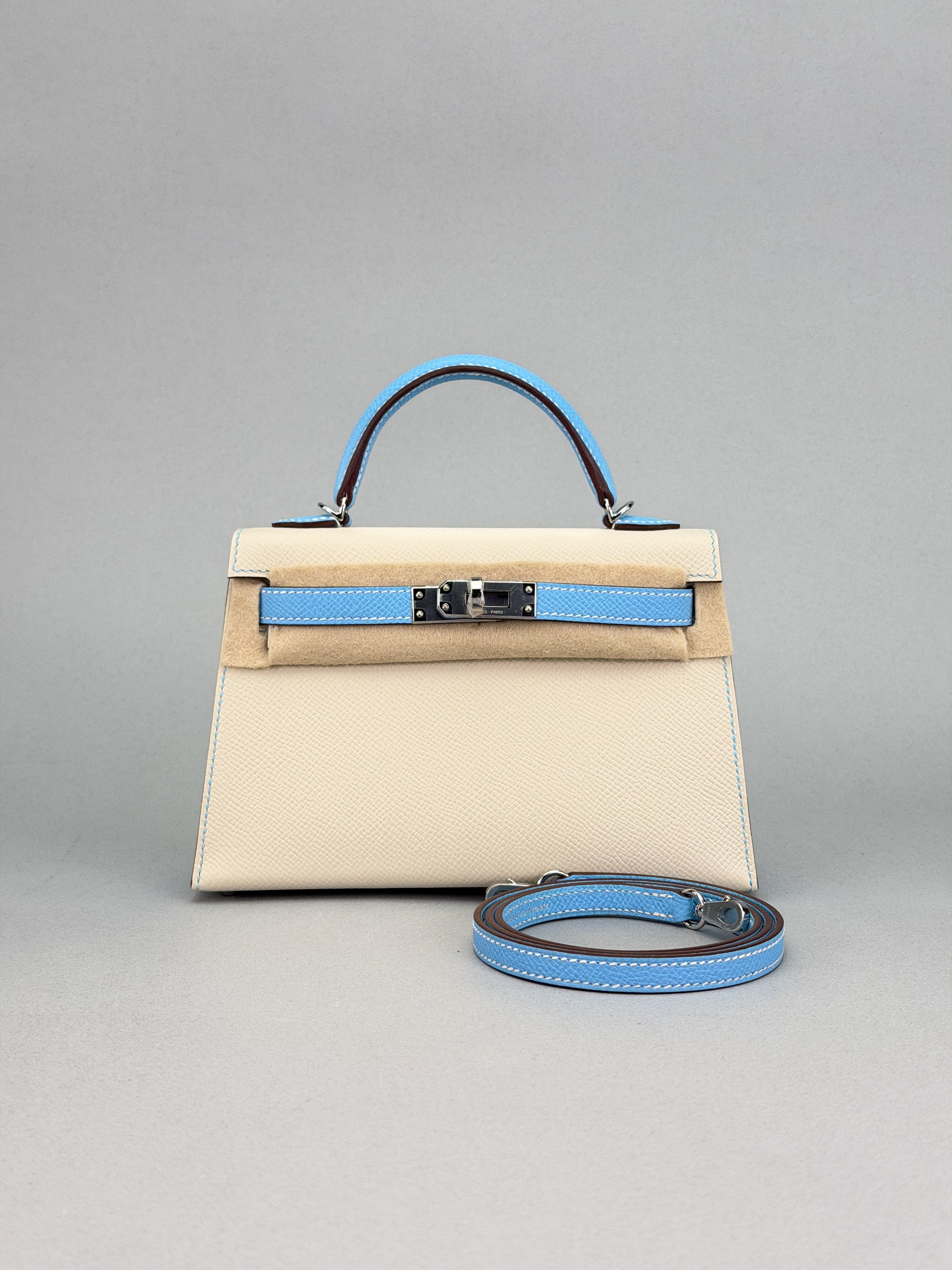 HERMES Mini Kelly 20 Epsom HSS Craie/ Blue Celeste Palladium Hardware Unworn
