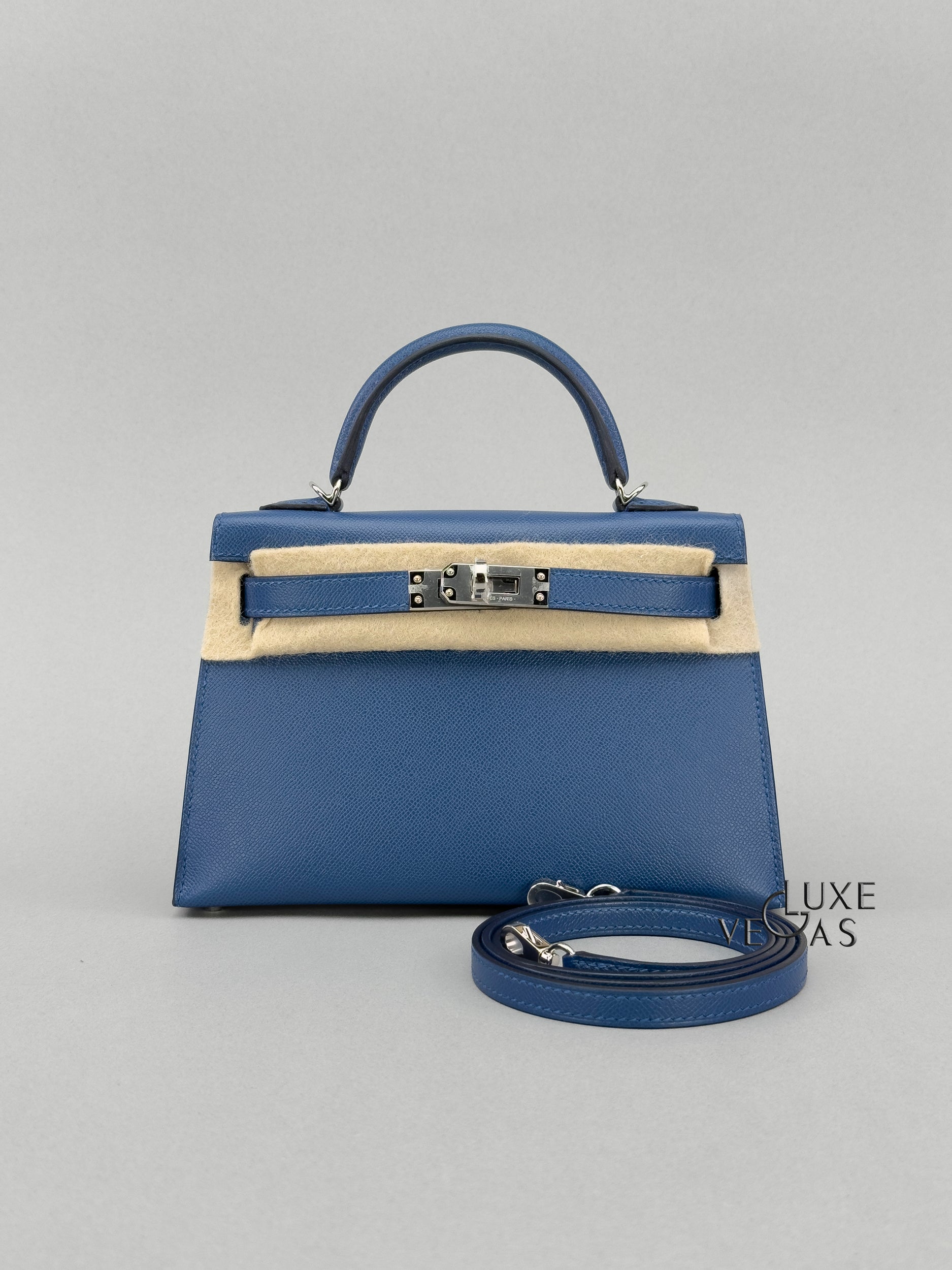 HERMES Mini Kelly 20 Sellier Madame Blue Tie Palladium Hardware Unworn