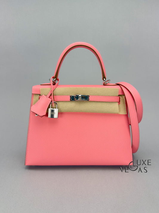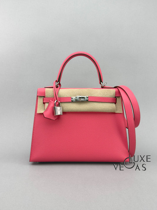 HERMES Kelly 25 Sellier Epsom Rose Azalee Palladium Hardware Unworn